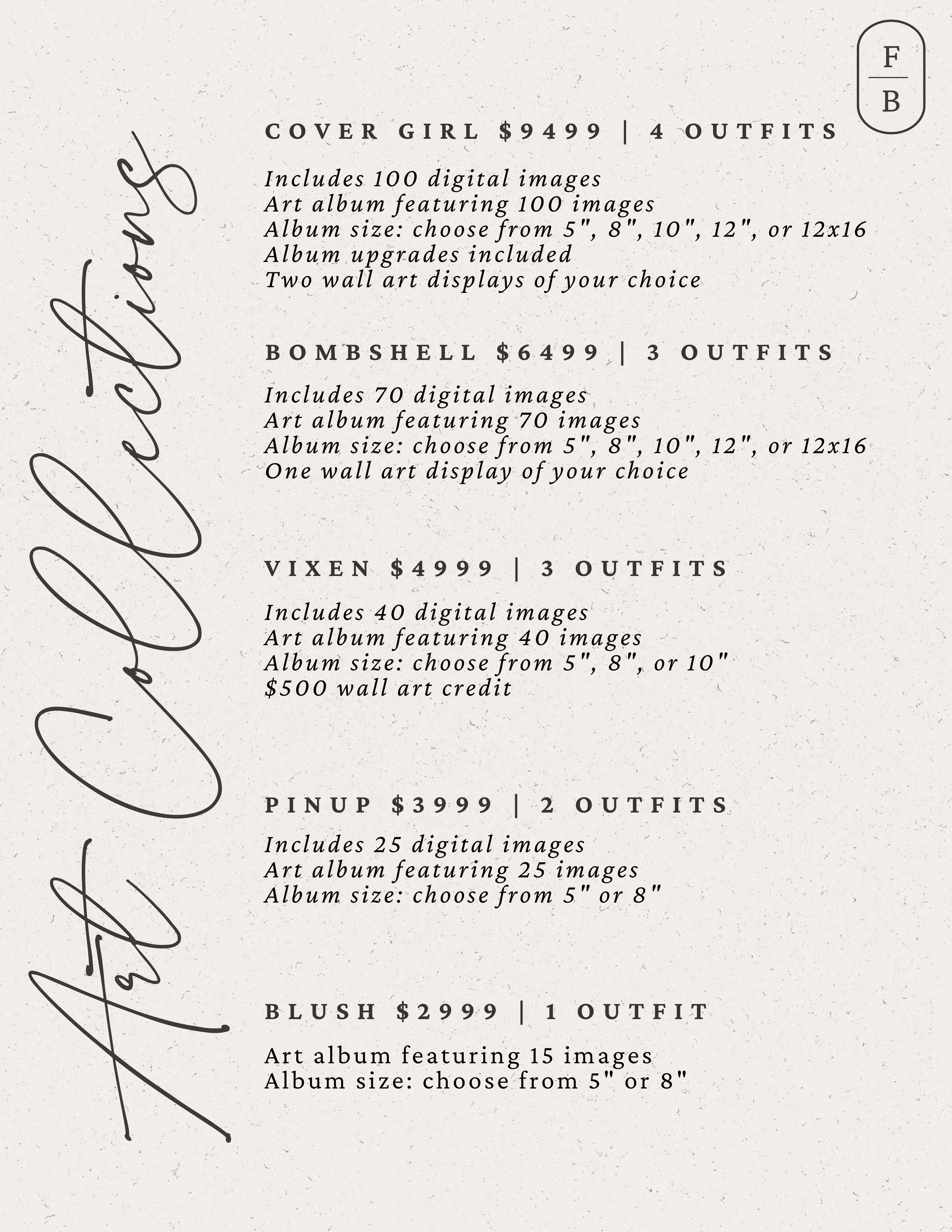 Most of my clients choose Bombshell or Vixen collection. If you are not sure, I'm happy to hop on the phone with you to guide you to the right collection! Please email me at contact@femboudoir.com