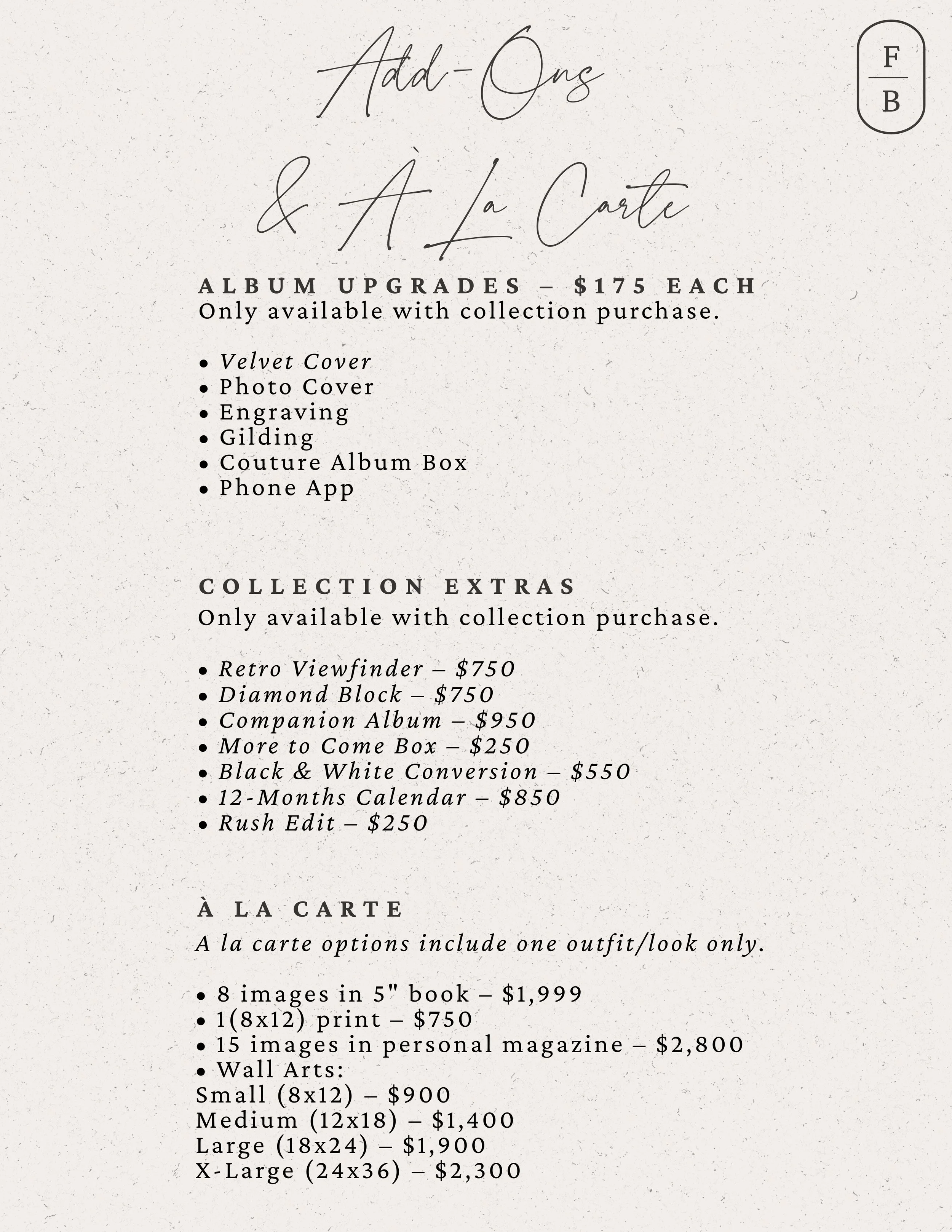 You're welcome to upgrade your collection at your same day reveal & ordering appointment if you love even more images than what is included in the collection you prepaid for, I'll just credit what you've paid so far to the new collection.